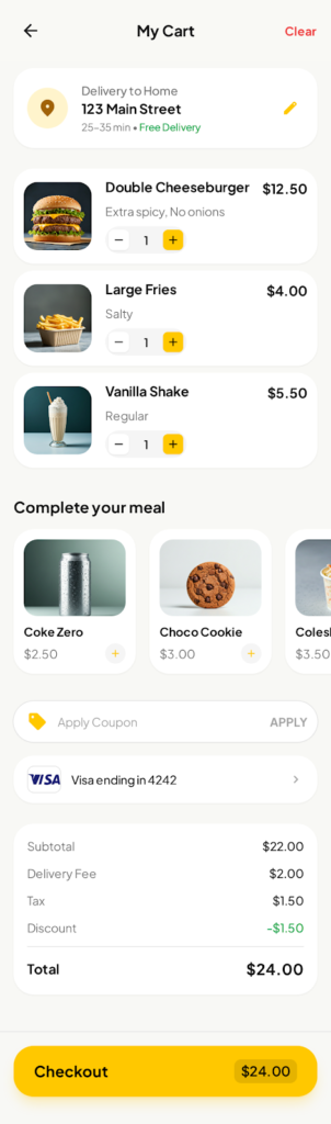 This project demonstrates a complete, end-to-end UX process for a real-world food delivery app—balancing business goals, user psychology, and scalable design systems to deliver a fast, delightful experience.