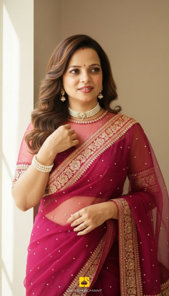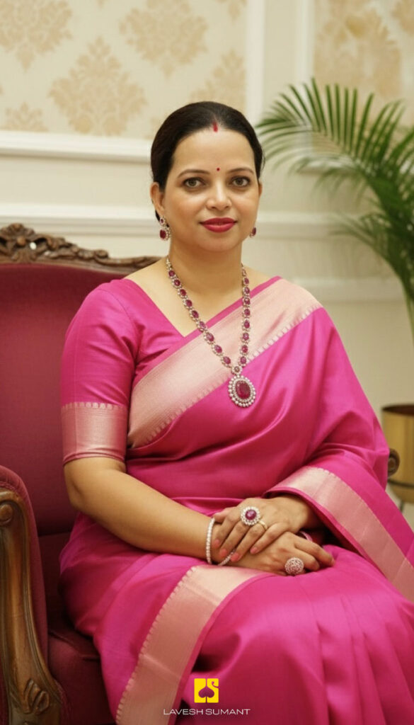 A composed seated portrait of a woman in a vibrant pink saree with soft blush borders, set within an elegant indoor setting. The upright posture, gentle smile, and harmonious surroundings convey assurance and warmth—capturing a moment where confidence feels settled, welcoming, and quietly assured.