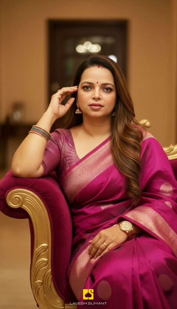 A poised indoor portrait featuring a woman seated on an ornate chair, dressed in a rich plum saree with subtle gold detailing. The steady gaze, relaxed posture, and balanced lighting convey quiet assurance—capturing a moment where confidence speaks through calm rather than expression.