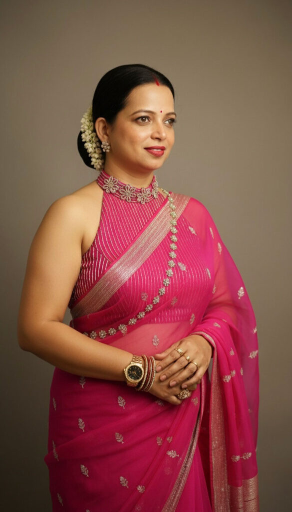 A refined studio portrait capturing a woman in a rose-pink saree with delicate detailing and contemporary styling. The soft sideward gaze, relaxed hand placement, and neutral backdrop highlight understated sophistication—where elegance feels natural, composed, and effortlessly present.